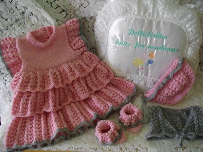 Instructions for a baby's or reborn doll's rara dress set in either 4ply or DK yarn depending on size. The set comprises of a 3 layered dress, cropped waistcoat, frilled bonnet and frilly socks in a lacy pattern. When knitted this set will fit a 15-16" reborn or 2.5-4lb baby, 16-17 inch reborn or a 3-5lb premature baby,18-19 inch reborn or a 5-7lb newborn, 20-21 inch reborn or 8-10lb newborn baby, or a 22 inch reborn doll or a 0-3 month baby. You will need between 200-250g 4ply or double knitting yarn in main colour, 50g contrast colour, either 2.75mm, 3.25, 3.75mm and 4mm needles, 3 stitch holders and 5 buttons. You will also need some spare needles in the size you are working with to hold the frills on.
