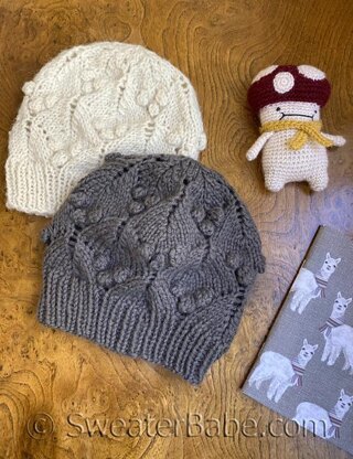It starts with the bottom ribbing. Then, transitions to the lace, which features clusters of bobbles for lots of fun textural interest. As you knit to the top, crown shaping maintains the aesthetic of the lace stitch and creates a lovely five-point star motif at the top of the hat.
