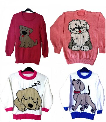 4 x Childrens & Adults cute puppy dog Jumper / Sweater Knitting Pattern