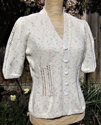 A cute cardigan with serious 40’s retro vibes. This design has a neat fit with shaping incorporated both by stitch decreasing and needle changes through the lace panel sections, giving added waist shaping too.