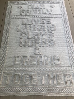 Blanket reads OUR FAMILY LOVES LAUGHS PLAYS WORKS & DREAMS TOGETHER