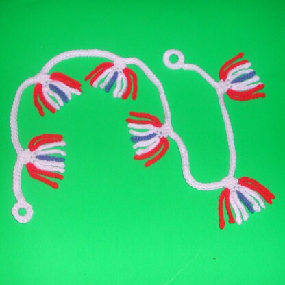 This garland will provide a lot of fun for your 4th of July celebration. Make a little one for a doorway or make a huge one to drape your deck. You could also substitute an array of other colors for the fireworks. You are only limited by your imagination. It is made with worsted weight yarn. The Fireworks are about 6” apart. The instructions tell you how to make the garland for any desired length.
