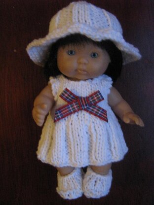 Really easy to make outfit for a 5" Berenguer doll, uses only knit and purl stitches. Instructions are for dress, hat, panties and shoes. The pattern uses 4 ply yarn and 2.25mm needles and is written in UK terms.