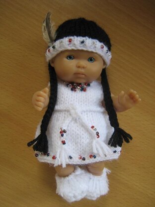 Really easy to make outfit for your 5" Berenguer doll comprising, dress with belt, headdress with braids to imitate hair, panties and fringed shoes. Seed beads have been added for decoration but take care with beads if children are playing with this item.
