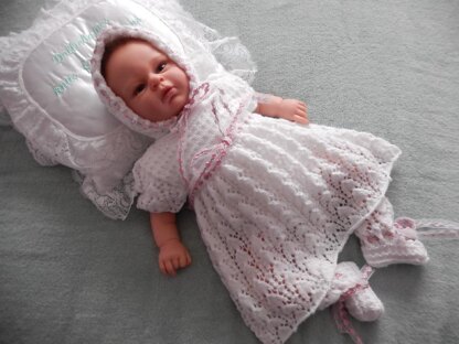 Instructions for a baby or reborn doll's dress set with a lacy pattern, textured bodice, and lacy sleeves. There is a bonnet and bootees to match. The bonnet has a lacy turned back brim. I have knitted the outfit shown in Wendy Peter Pan DK. When knitted this set will fit a 21-22 inch reborn, 19-20 inch reborn, 17-18 inch reborn or a 15-16" reborn, or babies 3lb through to 3 months.