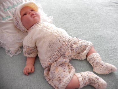 Instructions for a baby boy's or reborn doll's short sleeve sweater, shorts, peaked cap and two colour socks. I have knitted the outfit shown in Sirdar Snuggly DK, and Sirdar Snuggly Tiny Tots. When knitted this set will fit a 21-22 inch reborn, 19-20 inch reborn, 17-18 inch reborn or a 15-16" reborn, or babies 3lb through to 3 months.