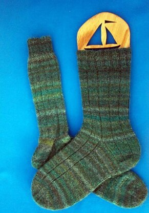 These socks are knit cuff-down to the toe and feature the traditional heel flap, a Dutch (square) heel turn and gusset construction method. The wide ribbing continues down the heel flap. Although the finished sock will appear to be very skinny, this is simply the effect of the ribbing and your sock will stretch to fit many different shapes of legs and feet!