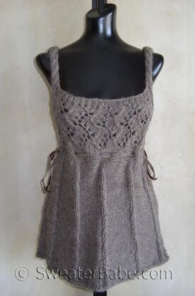 "Thin 2-stitch cables accent the shaping. A beautiful traveling vine lace stitch is used for the bodice and pretty 4-stitch cables make up the straps. A flattering squared neckline will work well with blouses or slim-fitting long sleeve tops. Velvet ribbon ties complete the look.