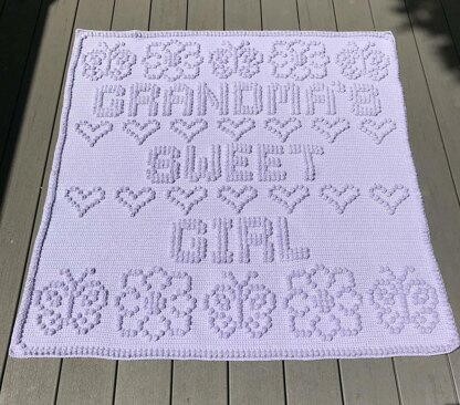This is a one piece blanket. GRANDMA’S GIRL. Blanket in photo was made with Caron One Pound & G hook. Finished size is 45 x 46. Yarn choice, hook size and tension may alter finished size.