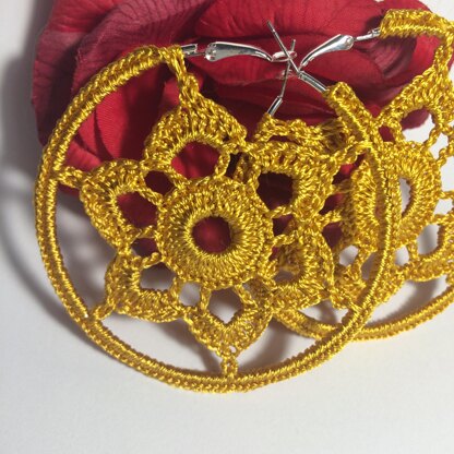 Pattern is written in English language, US terminology. PLEASE NOTE NEEDED SUPPLIES: * Steal hook size 1.6 mm (UK 4, US 7) * Microfiber lace weight yarn ( i used golden color Gazzal yarn 50g/260m (1,76 oz/284 yards) *A pair of metal round earrings, diameter – 2.75 inch Gauge: Works out to be about 2.75 inches in diameter, using the materials listed. You will need Adobe reader to open this pattern. Please do not copy, resell or distribute my patterns. You can sell products made by yourself using this pattern :) Wish you good luck in your work!