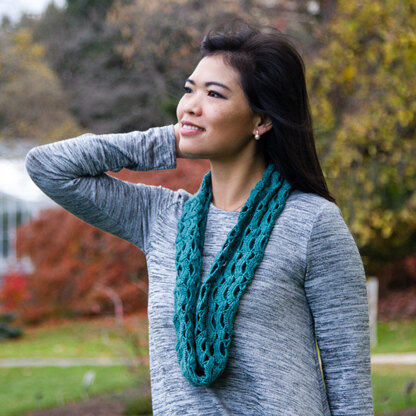 The unusual arrangement of stitches used in the Anouk Cowl from Valley Yarns creates an appealing combination of lace and texture. Crocheted in Valley Yarns 2/10 Merino Tencel, this light and versatile accessory can be worn long for for maximum decorative effect, or doubled up for a more snug fit.
