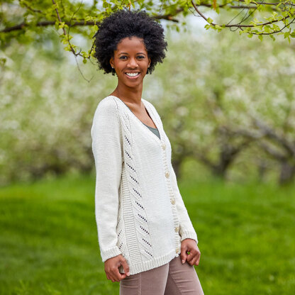 Wing-shaped eyelets frame raglan decrease in the Colum Cardigan from Valley Yarns. This jumper is knit seamlessly from the bottom up in Valley Yarns Northfield, a DK weight yarn with a slight silky sheen.