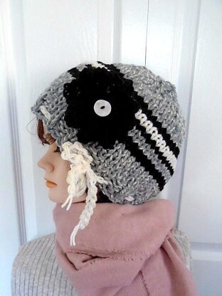 Gray Striped knitted Hat and Knitted Flower in all sizes from Newborn to Adult! Lovely hat, and flower! KNITTING FOR BEGINNERS, Flat knit!