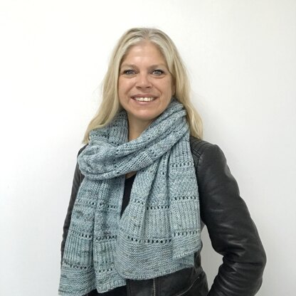 Using stitch patterns based on my 'Rocas' shawl, this rectangular scarf with crisp i-cord edges features graphic diagonal lines created by short rows and eyelets between easy-to-knit panels of different stitch combinations. This construction lends itself well to the use of tonal or speckled yarns but would also be striking in a solid color.