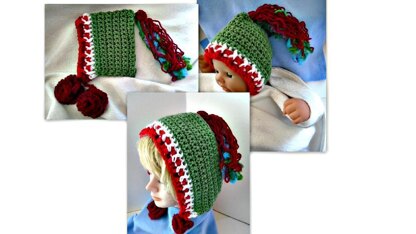 CHRISTMAS PIXIE, Crochet pattern, Hood, all sizes, baby to adult, flower ties.