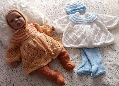 Instructions for either a boy's or a girls lacy matinee set, with footies, and a choice of a bonnet, or a cap with ear flaps that fasten with a strap.