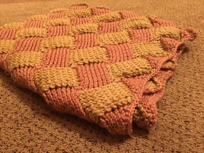 I used 2 skeins of each color for this project. Circular needles would be helpful for this project, although it isn't required. Gauge is not critical, but is included. Crochet hook is needed for one row border around blanket.