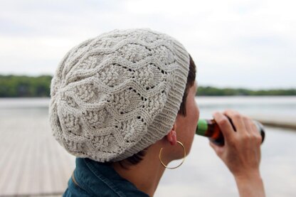 I love how the lines of the ribbing curve gently into the motif, and how the crown decreases with bold waves at the top. The garter and lace diamonds look like cables, but are actually worked using yarn overs and decreases, paired with garter stitch detail.