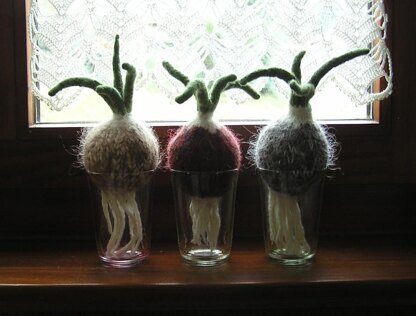 This hyacinth bulbs are felted in a washing machine. (40 degrees 1 hour) I used diffent yarns from my stash (only non-superwash). To be sure that your yarn will felt knit a little test swatch and wash it. For one bulb you need about 10 grams of brown yarn, 5 grams of white and 5 grams of green yarn.