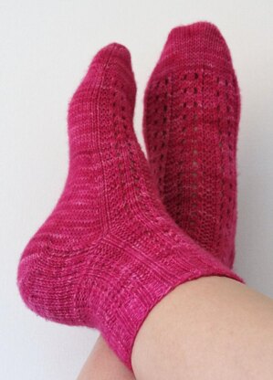 An easy lace ribbed sock pattern worked toe-up, with gusset and slipped stitch heel for better fitting. Instructions are written for magic loop method, the ribbed lace instructions are charted and written for your convenience.