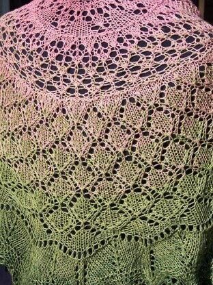 • shawl is started at the top with a garter tab of 9 sts. • there is a Lace Edging along the straight-edge of this shawl • lace pattern tiers are separated by inc rows to achieve the half-circle • all stitch pattern directions/charts are placed near where you will use them in the pattern • to make this shawl longer (after obtaining more yarn, of course), rep the final lace pattern (a 2-row rep) up to a total of 20 times to maintain the rati