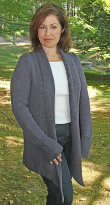 This sweater is designed for comfort as the name implies. It has set in sleeves with a slight bell shape and a cozy shawl collar.