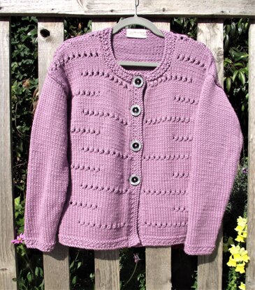 A stylish chunky cardigan with interesting staggered eyelet bands on the fronts. The sleeves and back are worked in stocking stitch. All the borders are worked in a beautifully neat mix of garter stitch and moss stitch, giving the perfect finish to this design.