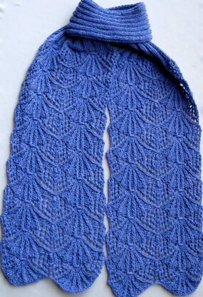 This scarf is both warm and elegant. The intricate stitch work is contained within the panels, which are highly visible, while the turtleneck part of the scarf will keep you warm on the coldest of days. The stitches here include lace, clusters and knit-purl combinations. The scallop at the end is a result of the placement of the stitches, and does not require any additional knowledge.