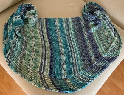„Aarionne“ ist ein großes symmetrisches Tuch in kraus rechts mit einer Umrandung im Lochmustern. Ich habe es aus einer Baumwolle als Sommertuch gestrickt. Es macht jedoch bestimmt auch aus einer weichen Alpaka- oder Merinomischung eine gute Figur und ist dann ein wärmendes Wintertuch.