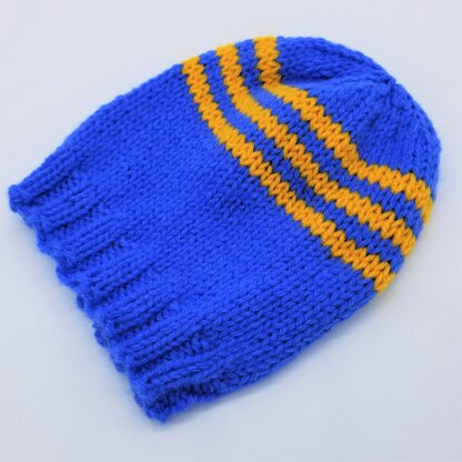 The Abee Creek child hat knitting pattern is a basic knitted beanie pattern, using knit & purl stitches and knitted flat, then seamed. The Abee Creek child hat has a 1 1/2” ribbing for a great fit, then the rest of the hat is knit in stockinette stitch with contrasting color stripes. Decreasing is simple (knit 2 together) style to shape the crown of the hat. The Abee Creek child hat is a great knit for beginners, makers, charity knitters and for quick last minute gifts.