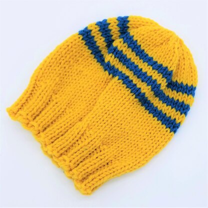 The Abee Creek Teen Hat Knitting Pattern is a basic knitted beanie pattern, using knit & purl stitches and knitted flat, then seamed. The Abee Creek teen hat has a 1 1/2” ribbing for a great fit, then the rest of the hat is knit in stockinette stitch with contrasting color stripes. Decreasing is a simple (knit 2 together) style to shape the crown of the hat. The Abee Creek teen hat is a great knit for beginners, makers, charity knitters and for quick last minute gifts.