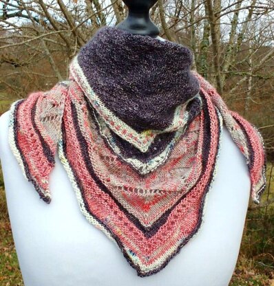 Abiding Joy is a pattern for a triangle shaped shawl using 3 (or more) colours with textured sts and small simple lace motif. In the pattern itself you may choose between 2 options of patterning for some sections.