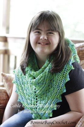 This scarf and/or shawl can be made using a variety of yarn choices, depending upon the season and size you desire. This design can be made to the size of your choosing with simple row repeats.