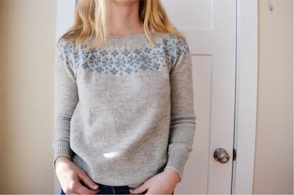 Scattered flowers dance across this beautiful, modern design that remains happily timeless. Abloom features a gorgeous wreath of flowers encircling the shoulders. The stranded colorwork motif is fun to knit and only uses two colors. Abloom is worked seamlessly top-down in the round with two sections of short rows in the yoke to ensure a flattering and comfortable neckline. The yoke is fully charted with written instructions for the body and sleeves.
