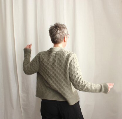 Abraxas has inviting texture, overlapping fronts, no buttons, and a slightly swingy shape that is easy to wear.