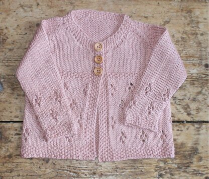 The Ada cardigan is knitted in one piece from the top down. The body of the cardigan is knitted flat, although circular needles are used to accommodate the shaping. Left and right leaning increases are used to shape the raglan sleeves and a few short rows are used to shape the neck. After dividing for the body and sleeves, an easy-to-work lace pattern is used for the remainder of the cardigan. Set-aside stitches are picked up for the sleeves, which are then worked in the round from the top down.