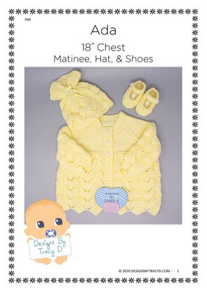 Ada is a Baby Knitting Pattern for a matinee coat, pineapple style Hat, and shoes to fit a baby 18" chest using DK yarn with 3.25mm & 4mm needles. It matches my 'Gwyneth' baby dress and pants pattern. You will need 200g of DK yarn for the set.