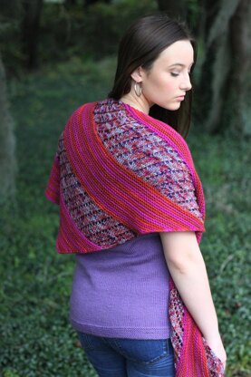The sample shawl uses 1 skein each of Troublemaker, Headstrong, and Windswept.