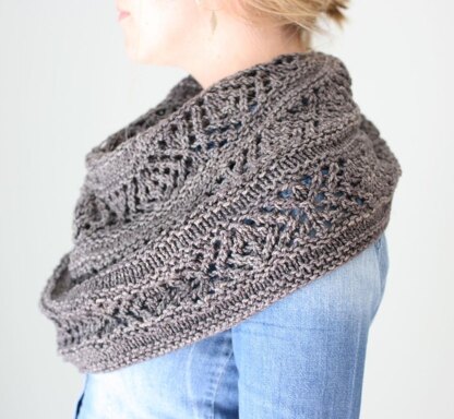 Similar in shape to my Starshower cowl, but in worsted weight yarn, Adama is a quick-to-knit shawl-cowl hybrid. Named for the Latin word for diamond (as well as, yes, the captain of Battlestar Galactica), it is shaped as a shawl, but the second half is worked in the round to create the illusion of a semi-circular shawl worn wrapped around the neck without ends to worry about tying. The majority of the cowl is done in a simple diamond lace pattern, with bands of Stockinette and Garter stitch breaking things up. Using a worsted weight wool- cashmere blend on large needles gives this cowl a cozy, rustic appearance and cuts the knitting time to practically nothing.