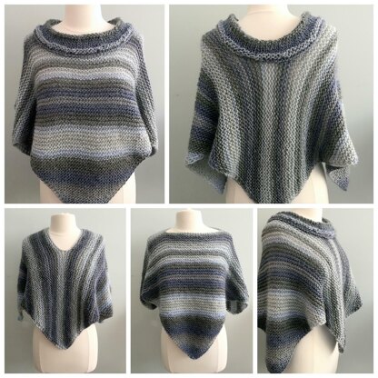 The Adelaide Poncho is a light weight airy garment perfect for layering. It boasts a wide collar with stitches that complement the garter construction of the poncho. The stitches used form a nice chain stitch appearance along the border of the poncho. Colorways are fun in this poncho and will create interesting patterns. Best of all, the easy knitting stitches make this a perfect beginner pattern.