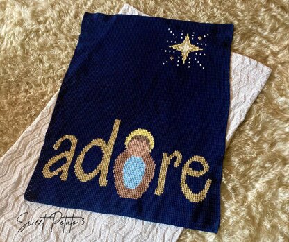 The Adore crochet blanket pattern is a fun, unique, modern crochet blanket design. This design features the word "adore" with a play on the letter "o" that features baby Jesus in a manger. The Northern Star is sparkling above in the nights sky.