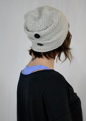 Adrastea is a reversible hat that buttons to create a gathered look, it is worked from the bottom up in the round. The stitch pattern works great for showing off the texture of a light colored yarn or for showing off color changes in semisolid yarns. Named for one of the moons of Jupiter, which was in turn, named for one of the nymphs that cared for Zeus in his infancy.