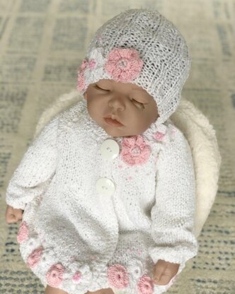 This cute very girlish sweater and hat, are simply knitted flat and sewed together, the edges of the sweater and flowers accents are crochet . Crocheted flowers and beads are sewed to the sweater and hat.