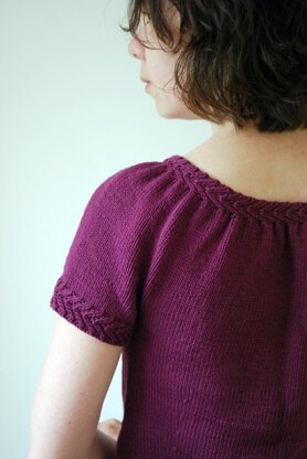 Inspired by the look of Eastern European peasant blouses with their simple elegance and beautiful silhouettes, this tee is an adult version of its younger sister Llani and is sized from 30 to 52 finished chest circumference with 2 inch increments. This top is worked from the top down in one piece, seamlessly. No finishing is required apart from weaving in ends. The tee is fitted with increase/deacrease darts at the waist and the hems are adorned with twisted rib pattern.