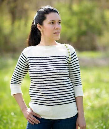 This relaxed raglan is a grown up version of the original Tide Pools. Gentle curves on the shirt-tail hem along with two options for button yoke closure add a sophisticated touch to an otherwise everyday pullover. This pullover is knit from the top down using raglan shaping. Yoke is worked flat, then body and sleeves are divided and knit in the round. Hem is shaped with short rows and finished with ribbing. Collar and cuffs are finished with I-cord. Yoke closure is picked up and worked in garter stitch. Two options for button closure are included.