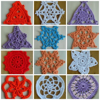 The decorations can be made in any yarn provided you use a suitably sized crochet hook.  In double knit yarn on a 4mm crochet hook the decorations are each between 10cm and 18cm high and use between 10m and 20m of yarn.