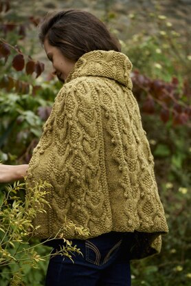 This heavily textured cape in Aran weight yarn is worked flat in panels which are then worked together in shaped saddle shoulders. The collar is worked separately in the round and then grafted on alternatively use three needle cast off if preferred. The panels are then stitched together omitting the Front slits which are edged in Moss Stitch.