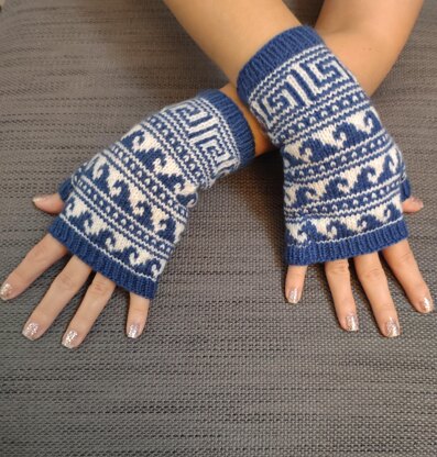 These Grecian fairisle mitts / fingerless gloves are worked in the round from cuff to palm. The design pays homage to my heritage with a Greek key design and geometric waves of the Aegean Sea. A pair of mitts can be knitted with two 50g balls of 4-ply yarn (one of each colour), leaving plenty to spare for other projects, so they are affordable to make and make perfect gifts.