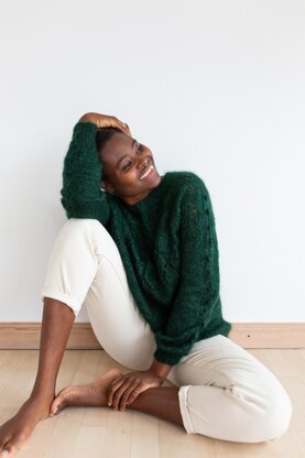 The sweater is knitted top-down. It starts with a slight boatneck and opens up in a beautiful full lace yoke with transparent leaves and textured buds, reminiscent of nature awakening after the rain. Due to the lacy pattern, the yoke forms a wavy transition to the lower body, adding to the natural flow of the design elements.