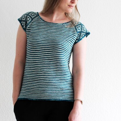This beautiful top features an eye-catching mosaic motif on the shoulders and stripes on the body to create a wonderful summer item in your favourite two colours that you’ll love to knit and wear during the warmer months of the year.